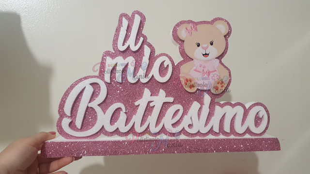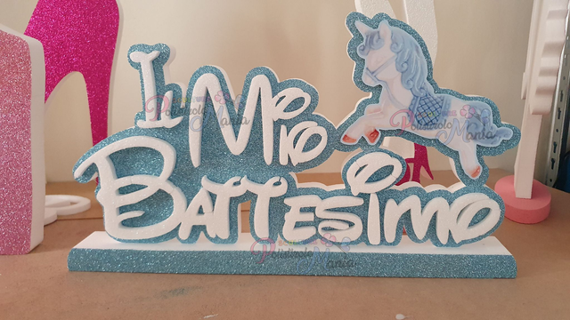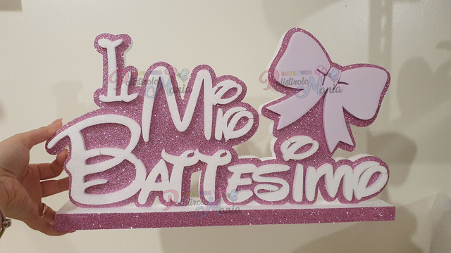 La scritta è bianca glitterata, con base glitterata frontalmente. Il colore della base sarà uguale a quello della scritta, salvo diversa indicazione nelle note dell’ordine, con possibilità di scegliere una base completamente colorata.